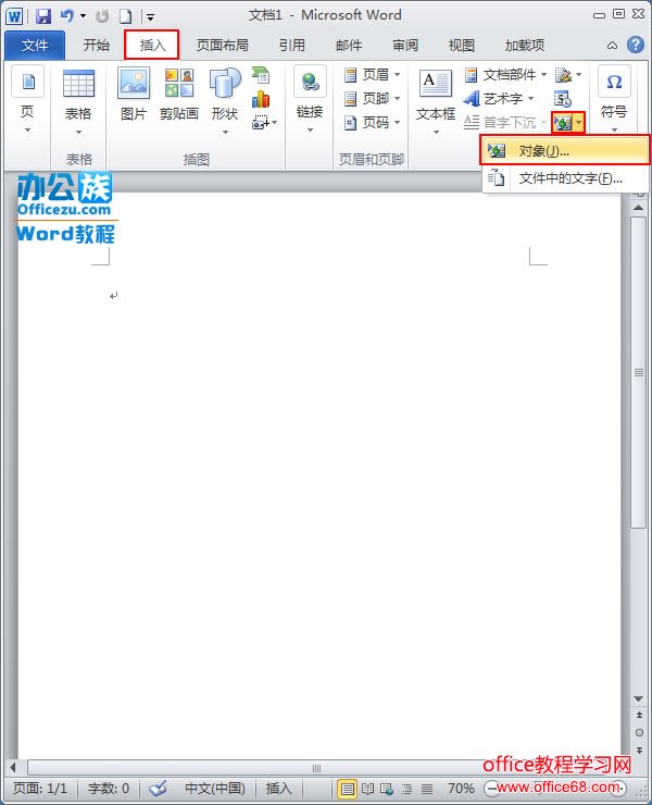 1 切换到【插入】选项卡,在【文本】选项组中单击【插入】—【对象】。
