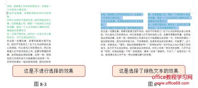 在执行分栏操作前,如果不选择文本,则默认是将分栏应用到整篇文档或当前光标所在节(如果文档分节了的话);如果选择了文本,则将分栏应用到所选文本。图8-3和图8-4就是在这两种情况下,都分两栏的效果,大家一看便知!