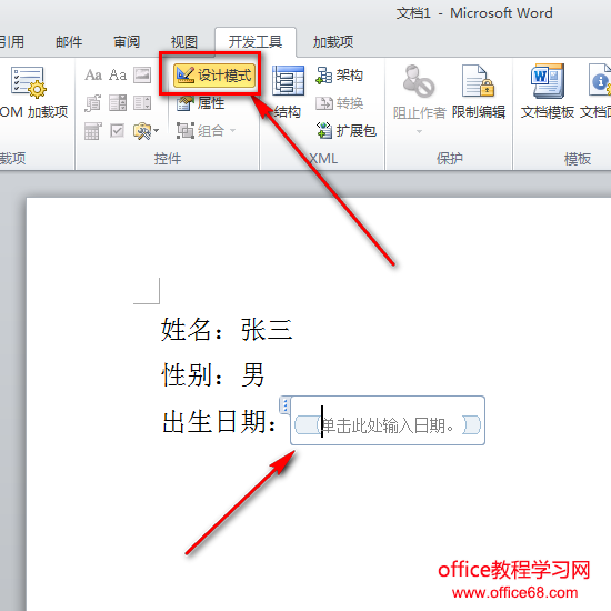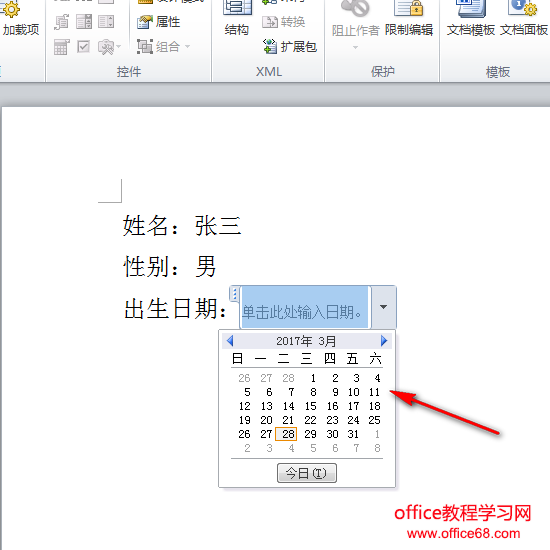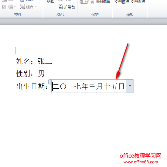 自己制作好的word文档,如果需要别人填写出生日期,可以通过使用日期控件来保证别人输入的日期格式一样。 1、如图,比如我们要在出生日期后面添加一个日期控件,就将光标定位在“出生日期:”后面。 ![]() 2、然后点击“开发工具”下的日期控件,如图所示。 ![]() 3、点击日期控件之后,“出生日期:”后面就会有一个文本框,这时候我们点击一下“设计模式”。 ![]() 4、如图,点击设计模式之后,文本框就会变成日历模式,可以选择自己的日期。 ![]() 5、如图,这就是选择好之后的日期,年月日被斜杠分隔开。 ![]() 6、当然,如果你不喜欢这种格式的日期,也可以点击一下开发工具下的“属性”,就会弹出一个属性面板。 ![]() 7、在属性面板这里,我们可以设置“日期显示格式”,然后点击“确定”。 ![]() 8、如图,小编设置了中文格式的日期。 ![]() |