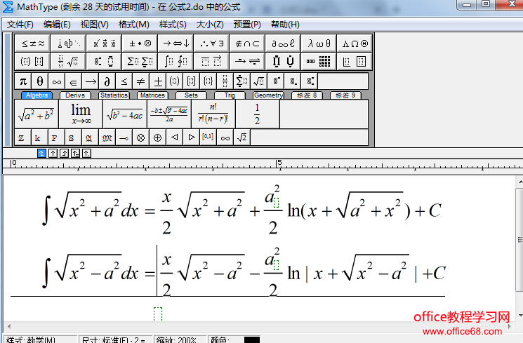指定对齐位置:当编辑多行公式时,往往需要将每行的等号或小数点之类的符号设置为垂直对齐。在MathType中很容易实现这一效果。只需在公式的某一行中的某个符号之前(或之后)按下快捷键“Ctrl+;”,插入一个对齐标志,在另一行中的某个符号之前(或之后)再次按下此快捷键,则这两行将以此符号为准垂直对齐。此功能类似于LaTeX中“&”符号的作用。