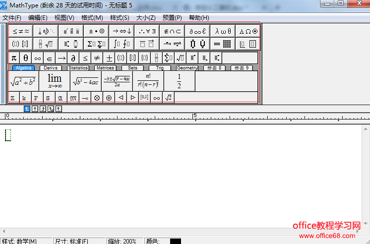 MathType数学公式编辑器的工具栏占据整个页面的上方,下图用红线标注出来的都是。