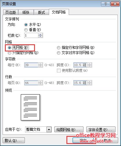 2.点击多选按钮后弹出页面设置对话框,单击“文档网格”选项卡,具体操作如下图所示: