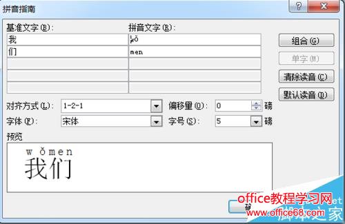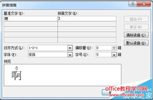 3、将出现如下界面,其中界面中出现的“基准文字”即是你输入的需要设置拼音的汉字;而“拼音文字”则是你这个汉字代表的拼音