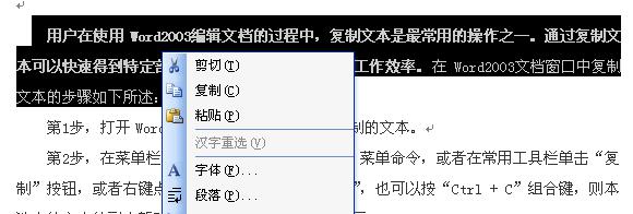 用户在使用Word2003编辑文档的过程中,复制文本是最常用的操作之一。通过复制文本可以快速得到特定部分文本的多份,从而提供了工作效率。在Word2003文档窗口中复制文本的步骤如下所述: