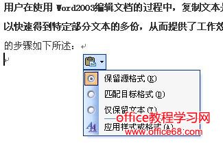 小提示:在执行“粘贴”命令后,Word2003文档中会出现一个智能标记,这就是“粘贴”选项按钮。将鼠标指向“粘贴”选项按钮并单击左键,在打开的下拉菜单中选择如何保留复制或移动后的文本格式,如图所示。