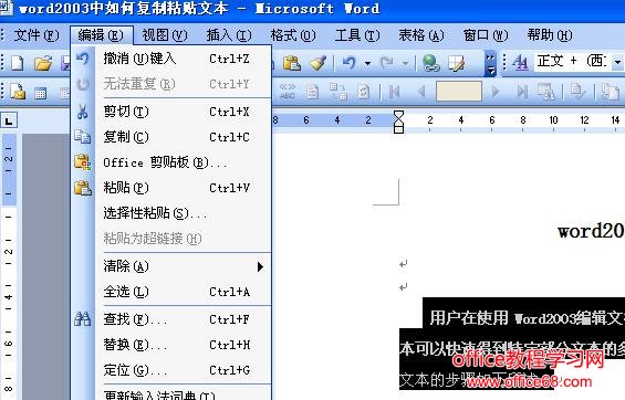 第3步,在Word2003文档中将插入点光标定位到目标的位置,在菜单栏依次单击“编辑”→“粘贴”菜单命令,或者在常用工具栏单击“粘贴”按钮,或者右键点击要复制的区域选择“复制”,也可以按下“Ctrl + V”组合键,则被选中的文本将被复制到插入点光标所在的位置。