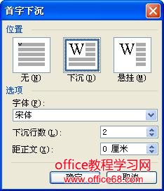 在弹出的窗口中我们可以清楚的看见有三种效果,无、下沉、悬挂,选种某种效果后单击确定按钮就可以了。当然,你也可以设置它的“字体”和“下沉行数”以及“距正文”!