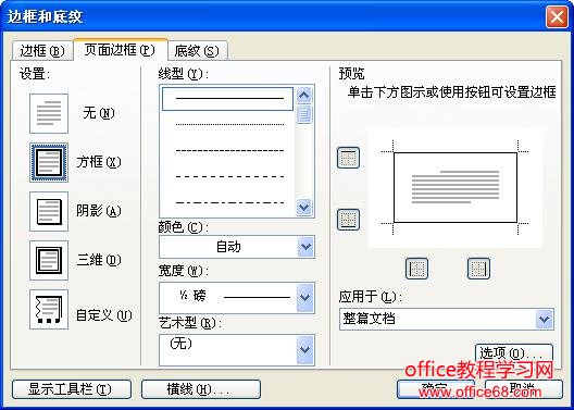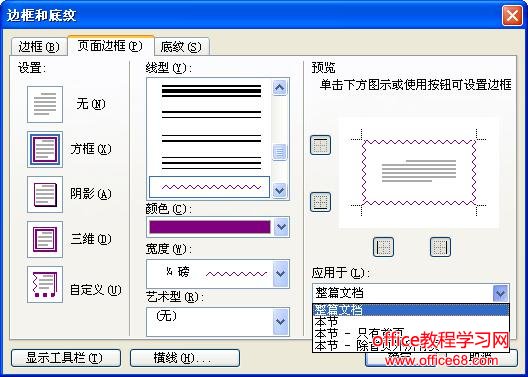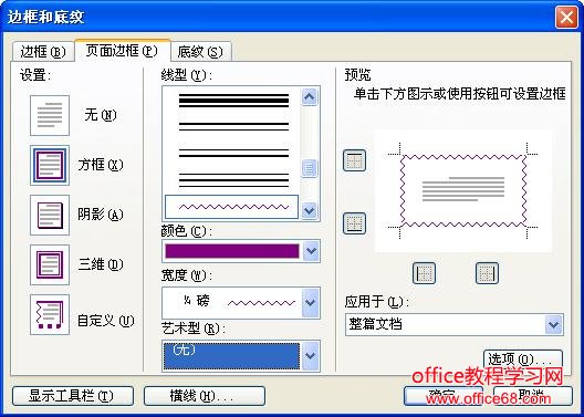 用户在使用Word2003编辑文档的时候,常常需要在页面周围添加边框,从而使Word2003文档更符合版式要求。Word2003文档中的页面边框包括“线型”边框和“艺术型”边框,用户可以根据需要自由选择。以设置艺术型页面边框为例,操作步骤如下所述: ![]() 第2步,在打开的“边框和底纹”对话框中切换到“页面边框”选项卡,在“设置”区域选中“方框”选项,如下图所示。 第3步,单击“线形”下拉三角按钮,在艺术型边框列表中选择合适的边框类型,并设置颜色和宽度,如图所示。 第4步,单击“应用于”下拉三角按钮,在下拉列表中选择页面边框的设置范围。用户可以选择“整篇文档”、“本节”、“本节-只有首页”、“本节-除首页外所有页”四种范围,设置完毕单击“确定”按钮,如图所示。 图 选择页面边框应用范围