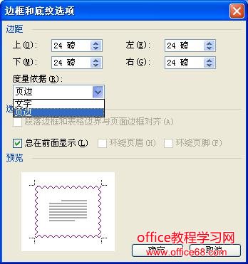 小提示:如果用户需要设置Word2003文档页面边框与页边距的位置,可以单击“选项”按钮。打开“边框和底纹选项”对话框,在“度量依据”下拉列表中选中“页边”选项;在“边距”区域分别设置上、下、左、右边距数值,并单击“确定”按钮,如图所示。 第5步,返回“边框和底纹”对话框,单击“确定”按钮使页面边框生效,如图所示。 ![]() |