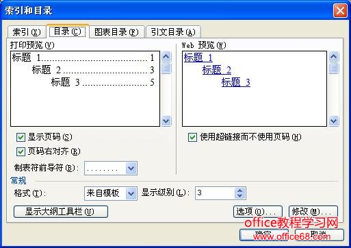 有些论文中对目录的格式有要求,这时我们就不能使用Word提供的目录样式了,需要自定义。需要指出的是,Word中,只能修改“来自模板”的目录样式,和索引相似。选择“来自模板”后,点击修改就可以修改各级目录所需的格式了。