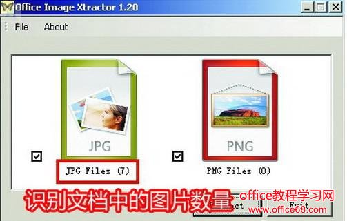 提取一个文档中的图片比较简单,如果是要提取多个文档中的图片的话,不可能一个一个地另存为网页吧?所以还是需要软件的支持,OfficeImageXtractor这款软件就能很好地解决问题。软件是英文版的,使用很简单,打开软件,如果是批量导出图片,点击“file”-“opendirectory”打开存放文档的目录,然后软件就会检测到这些文档中包含的图片数量,再点击“Extract”选择存放的图片的目录即可完成导出。