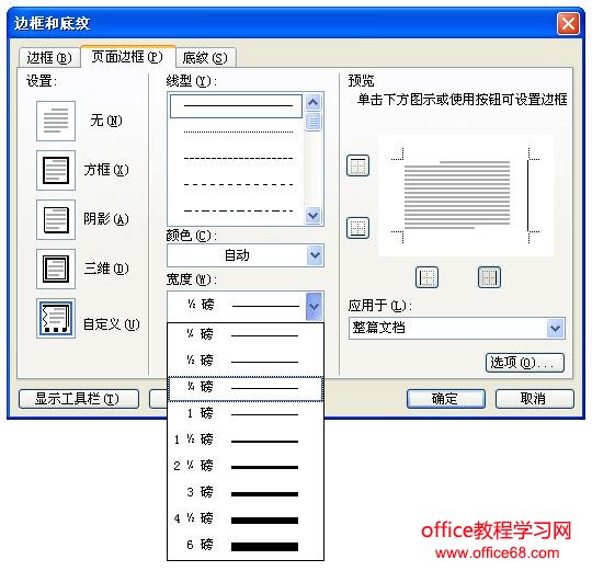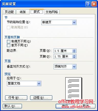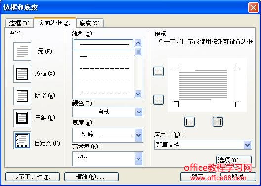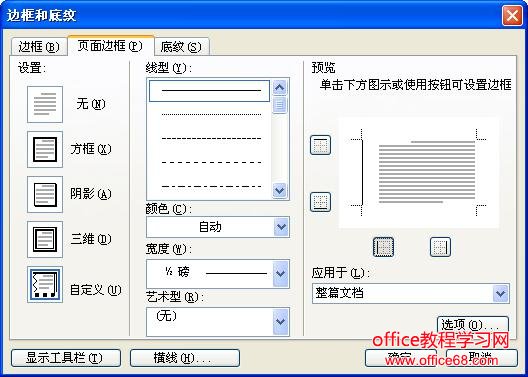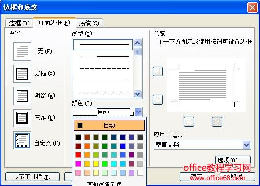 1、单击菜单“文件——页面设置”,如下图: ![]() 2、出现“页面设置”窗口,单击“版式”,然后单击下边的“边框”按钮,如下图: ![]() 3、自动进入“边框和底纹”下的“页面边框”选项,默认情况下在“设置”选项下是选择“无”的,这时通过右边的预览状态可以看到页面是无边框的,如下图: ![]() 4、如果页面的四边都需要边框,可以单击“设置”下的“方框”,如下图: ![]() 5、如果只需要左侧竖线,可以单击右边预览状态下的左侧竖线按钮,同时可以通过下边的“应用于”来设置边框线是应用于整篇文档或是某一页等,如下图: ![]() 6、如果只需要右侧竖线,可以单击右边预览状态下的右侧竖线按钮,如下图: ![]() 7、如果需要改变线型,可以先在“线型”下面选择相应的线型,然后再选择边框。如果需要改变线的宽度,可以先在“线宽”下面选择相应的线宽,然后再选择边框。如下图: ![]() 8、如果需要改变线的颜色,可以先在“颜色”下面选择相应的线条颜色,然后再选择边框。如下图: ![]() |