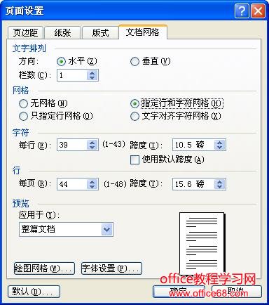 3、在“网格”设置栏,系统默认选择“只指定行网格”,这时,“字符”设置栏是灰色的,不起作用,而“行”设置栏为每页44行,可以设置每页的行数。为达到我们的目的,单击选择“指定行和字符网格”,这时“字符”选项变为黑色,可以设置每行的字符数了。我们按照自己的需要设定好每页的行数和每行的字数,然后确定完成。如果我们想让word以后新建文档时都是这样的设置,也就是作为系统的默认值,可以先单击“默认”后再单击“确定”。如下图: