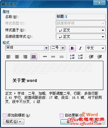 图二 “修改样式”对话框 3、点击“格式”按钮,在弹出的下拉菜单中选择“字体”选项,将弹出“字体”对话框,如图三。