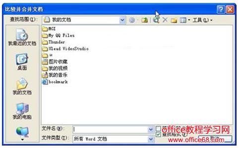 2、在对话框中找到要合并的目标文档,单击“合并”旁边的下拉按钮,可以在菜单中选择即将执行的操作。假如您要在原始文档中显示比较结果,可以单击“合并”命令;若要在当前打开的文档中显示比较结果,应当单击“合并到当前文档”命令;要想在新文档中显示比较结果,就要选择“合并到新文档”命令,如图: