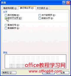 如果该单元格太高,不得不跨页断行的话,执行“格式”下的“段落”命令,将段落对话框中的“换行和分页”标签中的“段中不分页”复选框选中,如图2所示,这样可以使跨页点不拆分同一单元格的正文段落,而且可以重复栏标题。