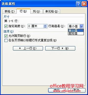 (2)可能要显示的文本高度超过了指定的固定行高。请单击该单元格,再单击【表格】|【表格属性】命令,然后单击【行】选项卡。在【行高值是】下拉列表框中,选择【最小值】选。如果清除【指定高度】复选框,Word则会自动调整文本的高度。
