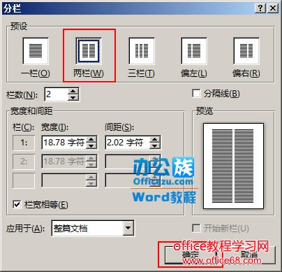 3 此时会弹出一个“分栏”对话框,大家可以根据自己的需要在其中设置栏数、宽度、间距以及分隔线,在看到右边的“预览”区域中出现自己心仪的效果后,单击“确定”按钮即可。