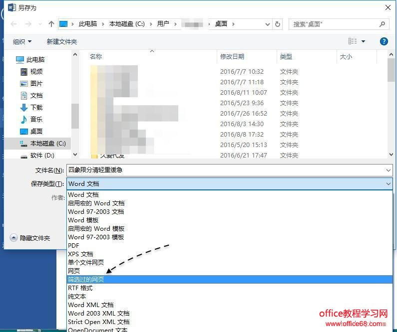 接着在列表中,选择「筛选过的网页」一栏选项。如果你的 Word 版本不同,只有「网页」选项的话,就选择网页即可。