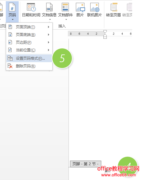 接下来,插入页码即可,但默认情况下会显示为第三页页码,如下图4处。所以需要利用“设置页码格式”改为页码起始值为1。(下图5处)