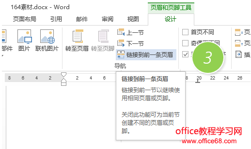 然后单击取消“页眉和页脚工具—链接到前一条页眉”的功能。让第三页和前面两页彻底“分家”。(下图3处)