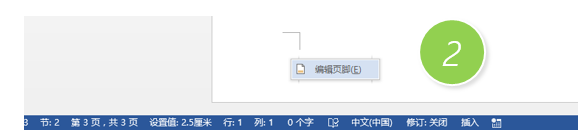 然后到第三页的页脚位置,鼠标右键,编辑页脚。(下图2处)