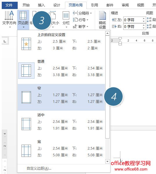 这时Word会新插入一页页面。如果你将光标停在第二页上,在去设置页边距。比如选一个比较窄的页边距。(下图 4 处)