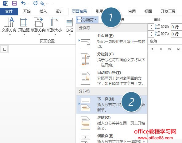 新建一个Word文档,点击“页面布局—分隔符—分节符(下一页)“。(如下图 2 处)