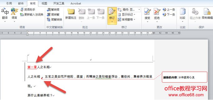 首先要开启这些标记,需要先将Word文档变成可“修订”状态,只需要点击“审阅—修订”按钮即可。(下图箭头处) 开启修订功能之后,如果你添加内容,比如在下图中添加“第一章”就会红色显示,或者 删除了“分体貌和心灵”文字,就会默认在批注栏显示被删除的文字。如下图