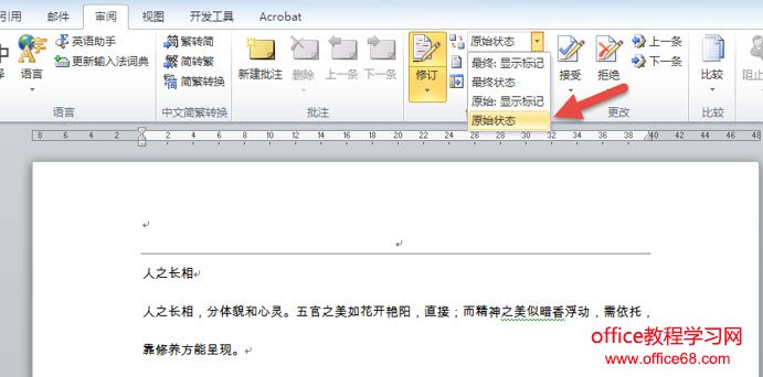 如果将其设置“原始状态”,则完美显示文档没修改前的状态。(实际上文档已修改,只是查看方式为原始状态,也就是我们所说的初稿),仿佛文档没有被修改过。