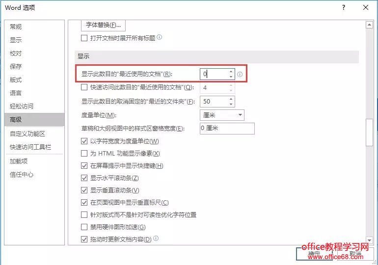 (2)选择“高级”选项,在“显示”栏中设置【显示此数目的‘最近使用的文档】数值,如这里设置为“0”,单击“确定”按钮。