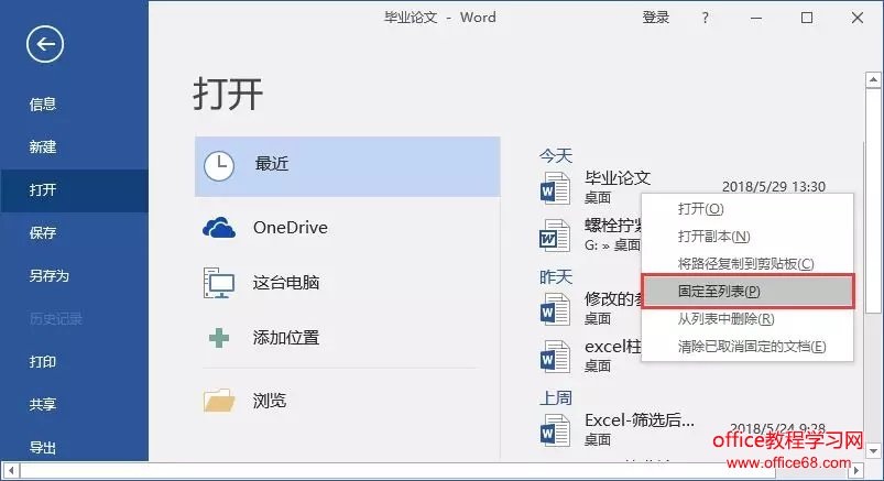 技巧提示:如果需要取消固定在列表中的文档,可以在该文档上右击,选择”从列表中取消固定“。