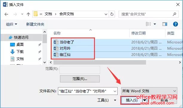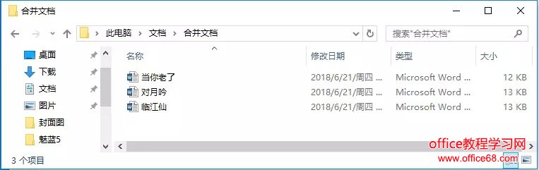 如下图所示,将3个Word文档中的内容合并成一个文档