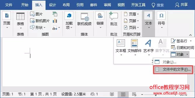 (1)打开一个空白文档,或指定一个文档,点击【插入】-【对象】-【文件中的文字】。