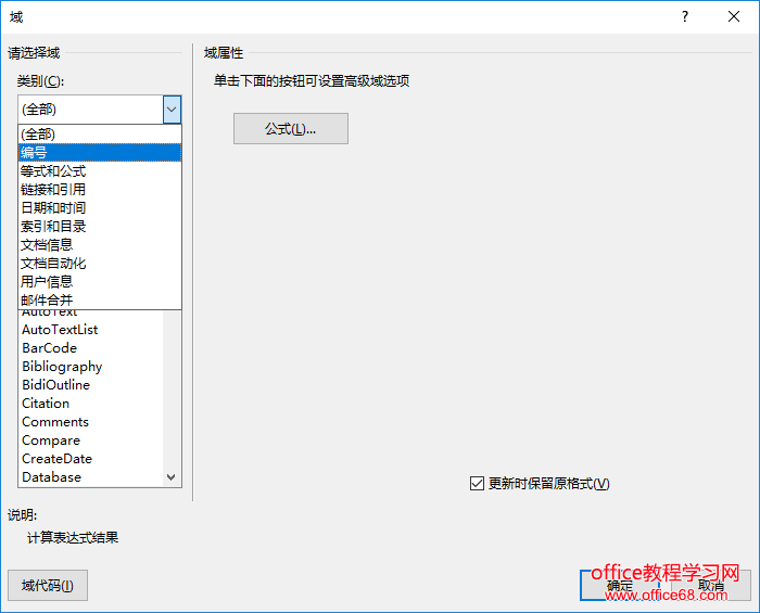 ![]() 打开“域”对话框,在“类别”下拉列表中选择相应的域类别。