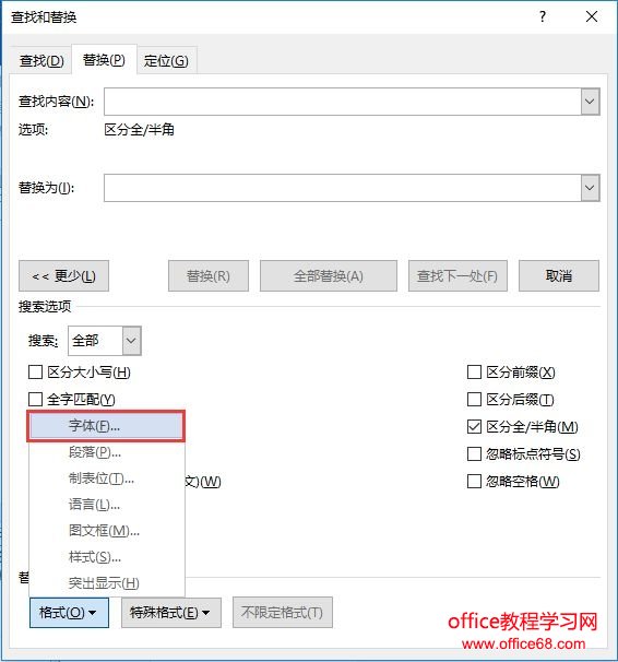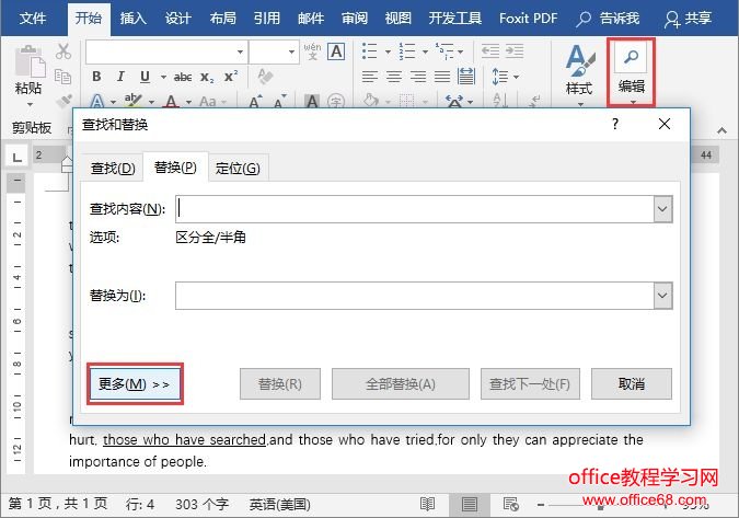 (1)点击【开始】-【编辑】按钮,选择“替换”命令或直接按【Ctrl+H】组合键,打开“查找替换”对话框,选择”替换“选项卡,将鼠标光标定位于“查找内容”文本框中,然后单击“更多”按钮。
