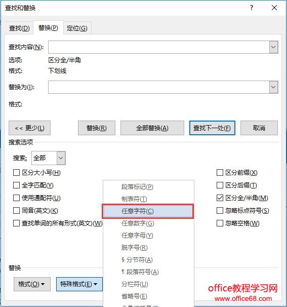 (3)返回”查找和替换”对话框,单击“特殊格式”按钮,在弹出的快捷菜单中选择“任意字符”命令。