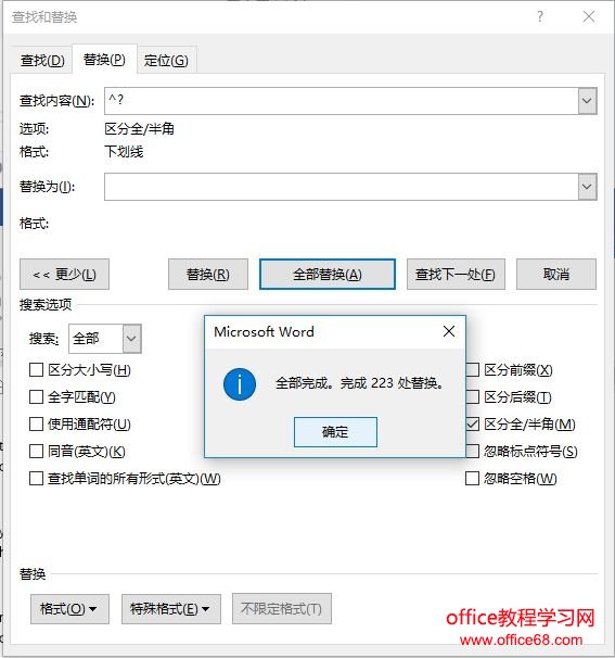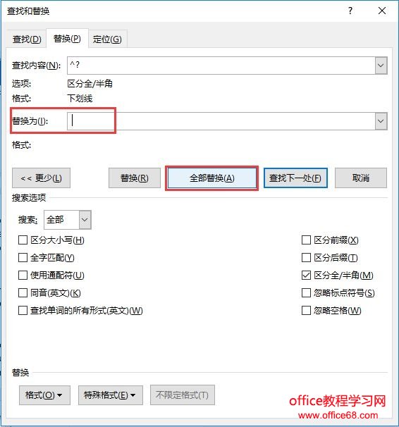 (4)将光标定位于“替换为”文本框中,然后按一下空格键(Space),再单击"全部替换"按钮。