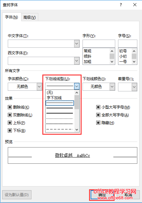(2)选择【格式】-【字体】命令,打开“字体”对话框,在“下划线线型”下拉列表中选择文档中所使用的下划线线型,这里选择”单下划线“,然后单击”确定”按钮。