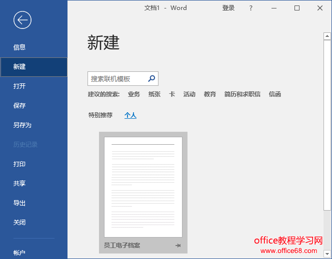 ![]() 保存之后,单击【文件】-【新建】命令,选择“个人”,我们就可以在这里快速找到自定义的Word模板了。单击一下模板图标,即可快速完成创建。
