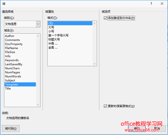 ![]() (2)打开“域”对话框,在“类别”下拉列表中选择“文档信息”,在“域名”列表框中选择“Template”域,然后勾选“添加路径到文件名”,单击“确定”按钮。