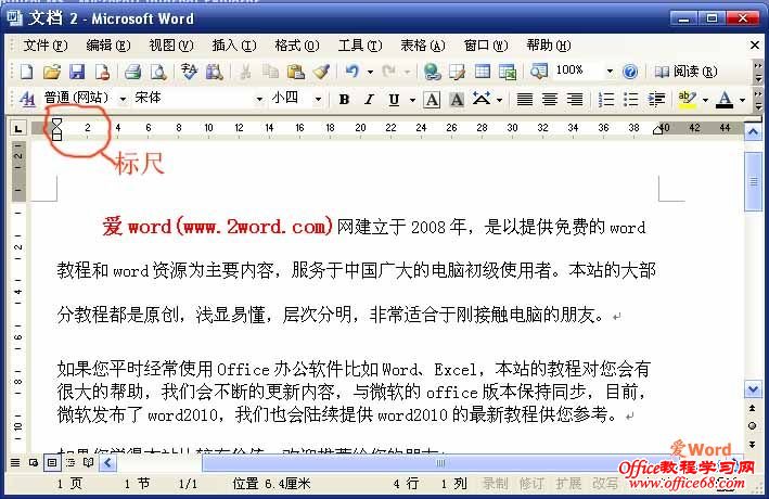 二、标尺 1、在页面的上边有一个标尺,上面显示了页面的缩进情况,利用它可以快速定位缩进量。如图四。