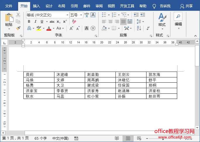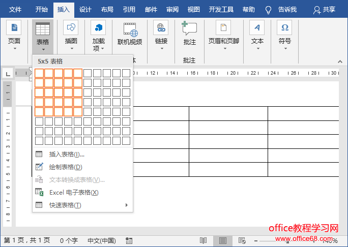 第一步:在Word中点击【插入】-【表格】按钮,按照座位行数和列数在Word中插入一个表格,这里我们插入一个五行五列的表格。