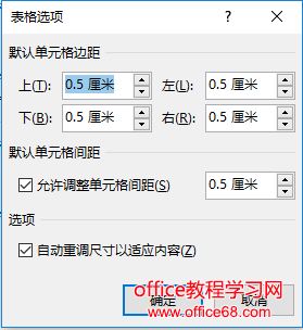 第四步:打开”表格选项"对话框,设置上、下、左、右单元格边距为“0.5厘米”,然后勾选“允许调整单元格间距”复选框,并设置“间距”为“0.5厘米”,点击“确定”按钮。