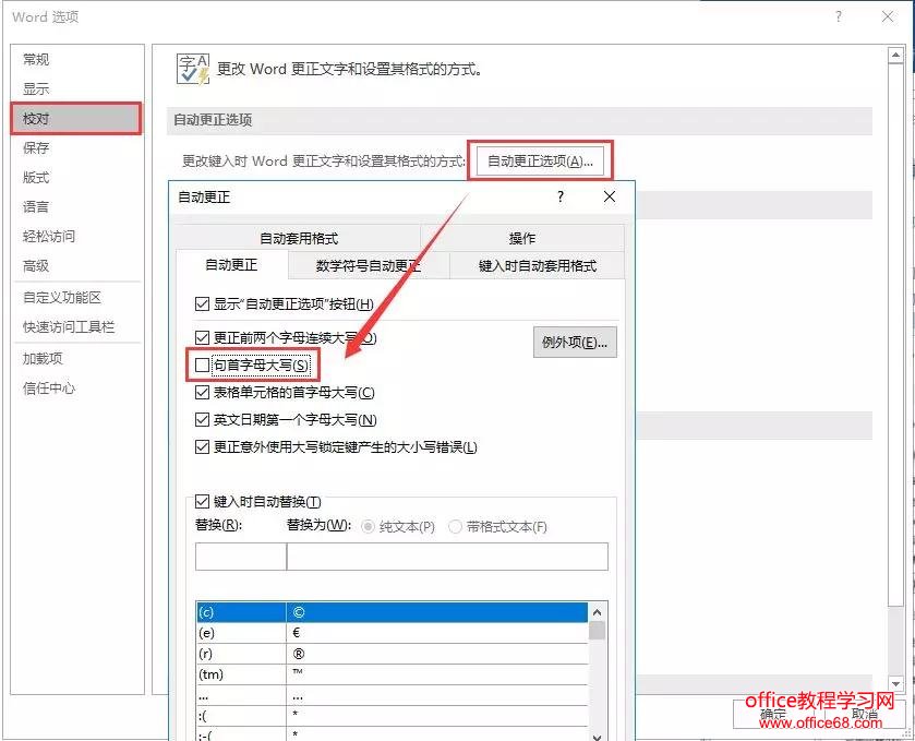 单击【文件】-【选项】-【校对】-【自动更正选项】按钮,打开【自动更正】对话框,取消勾选“句首字母大写”复选框,单击“确定”按钮即可。
