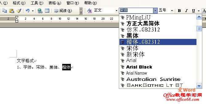 五、同样再拖黑选中“楷体”这两个字,在工具栏中点下拉按钮,选择“楷体_GB2312”,把字体改成楷体。如图四。