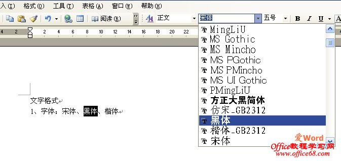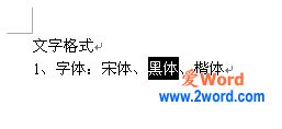 二、宋体是最常见的字体,默认输入的文字就是宋体。 三、选中文字“黑体”。方法是:把鼠标移到“黑”的左边,按住左键不松,拖动“体”的后边,这时候“黑体”两个字就被选中 ,颜色变成黑色(反白显示)。如图二。