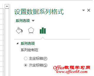 选择“系列2”,在“设置数据系列格式”窗格中选择“次坐标轴”,将该系列绘制在次坐标轴上。