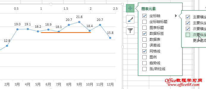 保持“系列2”的选择状态,依次单击图表右侧的“图表元素”按钮(“+”号)→坐标轴,单击其右侧的三角形按钮,勾选“次要横坐标轴”,取消选择“次要纵坐标轴”,让次要横坐标轴显示出来,同时隐藏次要纵坐标轴。