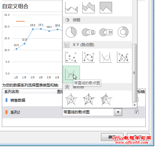 3.右击“系列2”,选择“更改系列图表类型”,在弹出的对话框中将“系列2”的图表类型改为“带直线的散点图”。